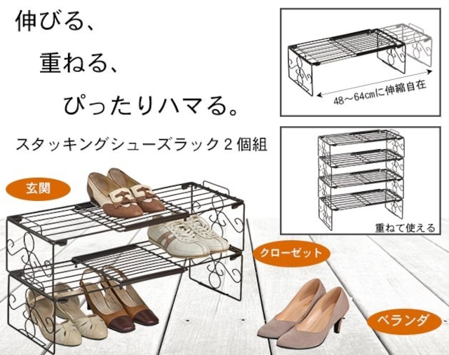 玄関先スペースに合わせて伸縮自在のシューズラック。 玄関に出しておきたい靴を整理整頓。 透け感を活かして軽やかでエレガントに収納。 玄関先の少ないスペースでも圧迫感なくスッキリ整頓できます。 幅は48~64cmに伸縮自在でスペースに合わせてピッタリ収納ができます。 1段あたり3足収納可能。4段重ねも可能。 【サイズ】約48~64×24.5×18cm 【重量】約1.3kg/個 【梱包サイズ】約59.5×13.5×26.6cm 【梱包重量】約2.85kg 【材質】スチール(エポキシ樹脂粉体塗装) 原産国:中国 【キャンセル・返品について】 キャンセル・返品については「特定商取引法に基づく表記」のページをご確認ください。 サイズ違いや、色のイメージ違いでの返品・交換のご要望は承りかねますので、 注文の際にはくれぐれもご注意ください。 【出荷目安、配送、送料に関する注意事項】 ・本商品は仕入元もしくはメーカーより配送となります。 ・お取り寄せ商品の為、稀にご注文入れ違い等による欠品・遅延となる場合がございます。 ●この商品の出荷目安は以下の通りとなります。 7 - 14営業日 ※土日・祝除く ●梱包区分 本商品は梱包区分上、他商品と同時に購入された場合や同品の複数購入時には梱包や配送が分かれます。 ●送料 ・商品価格は送料込の金額です。(北海道、沖縄、離島を除く) ・離島および一部地域へは配送ができない場合がございます。
