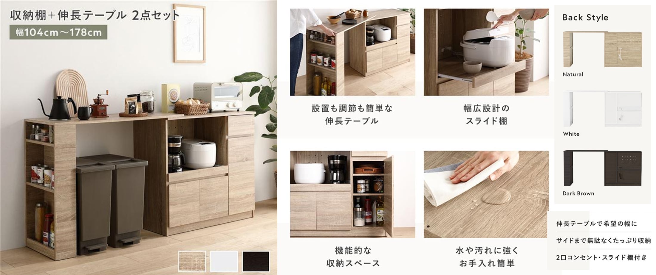 収納棚+伸長テーブル 2点セット 幅104〜178cm 2口コンセント付き キッチン収納 食器棚 選べる3色