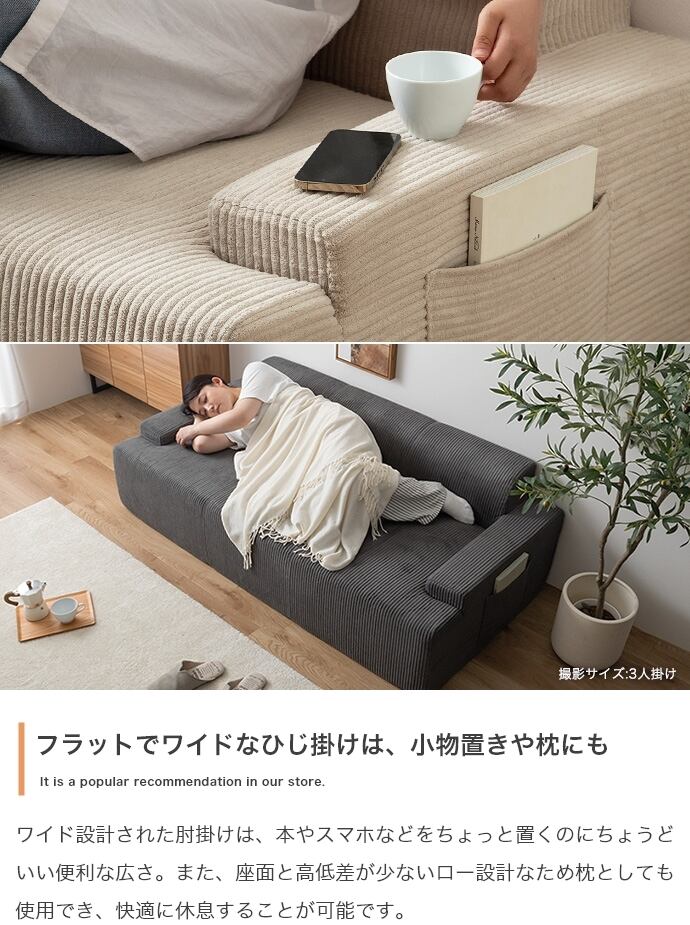 両側には小物の収納に便利なポケット付きで、リモコンや雑誌などをさっと片付けできます。