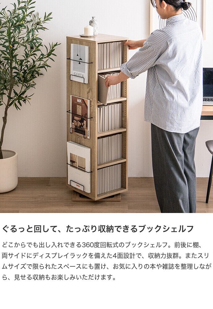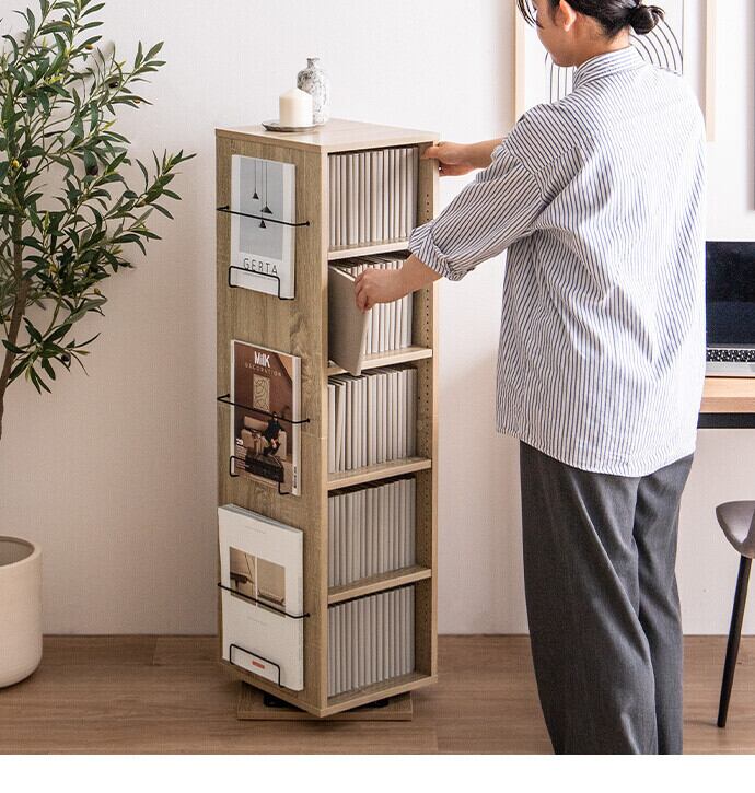 どこからでも出し入れできる360度回転式のブックシェルフ。