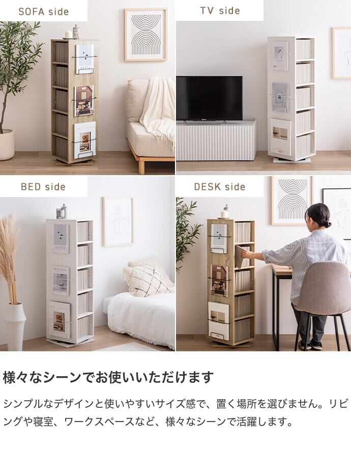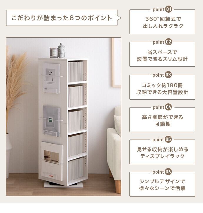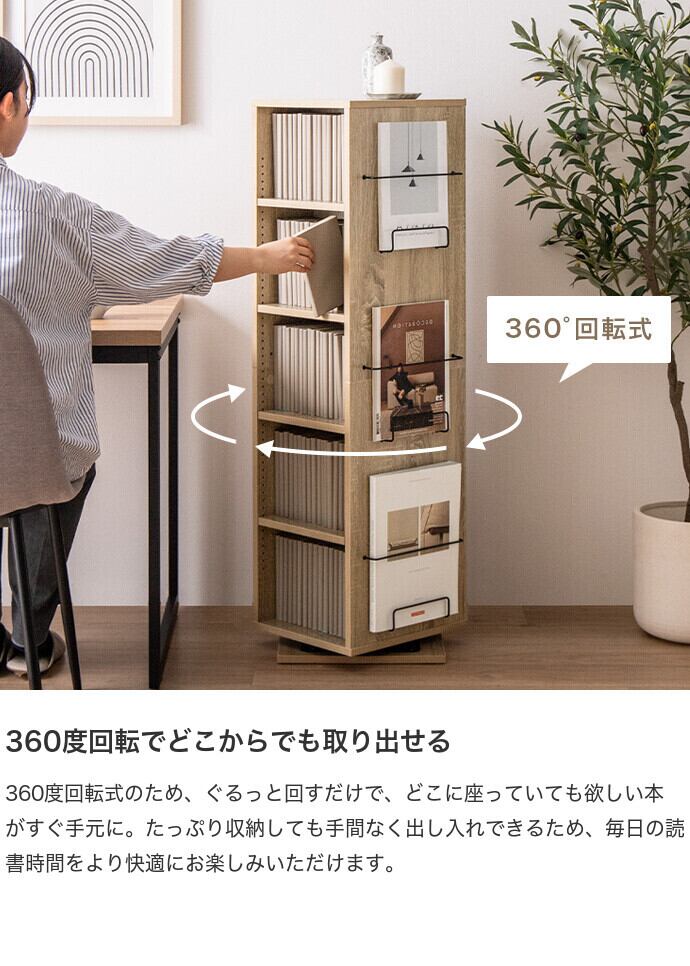 360度回転式のため、ぐるっと回すだけで、どこに座っていても欲しい本がすぐ手元に。
