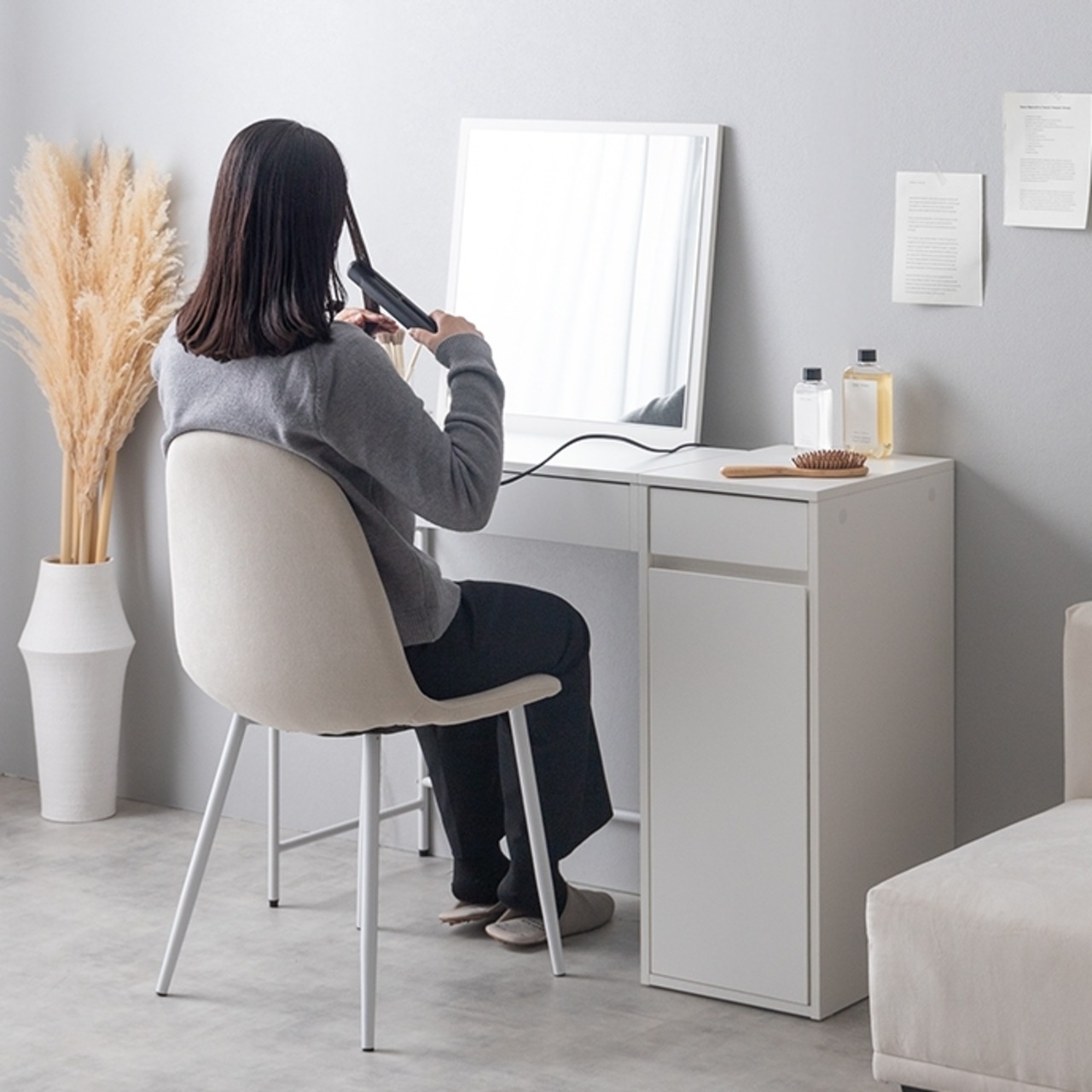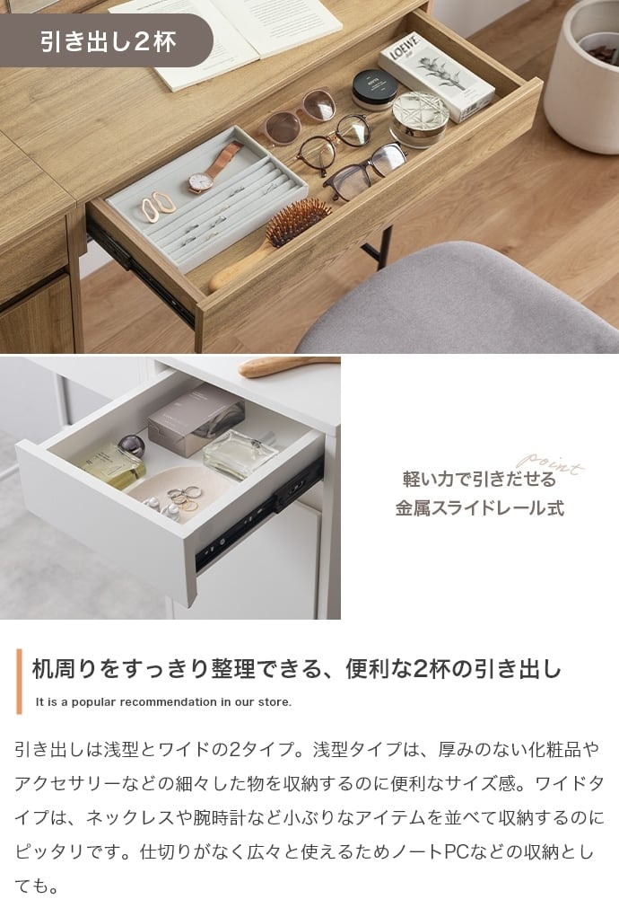 ゆったり使える広めの天板に、コスメやボトル類を整理できる引き出し&扉収納で、大容量収納を実現。