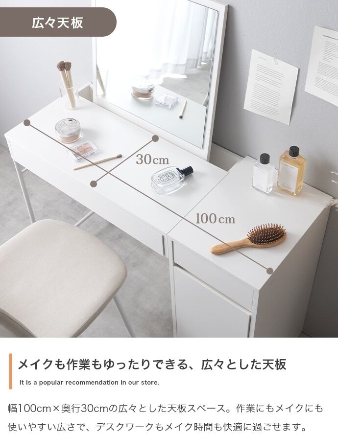 幅100cmの天板とワイドミラーで毎日のメイク時間を快適に。