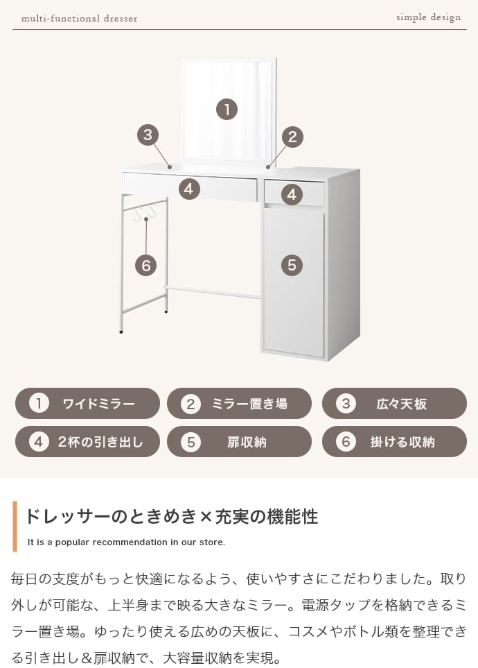 広々と使える天板とワイドミラー、たっぷり収納が魅力のドレッサー。