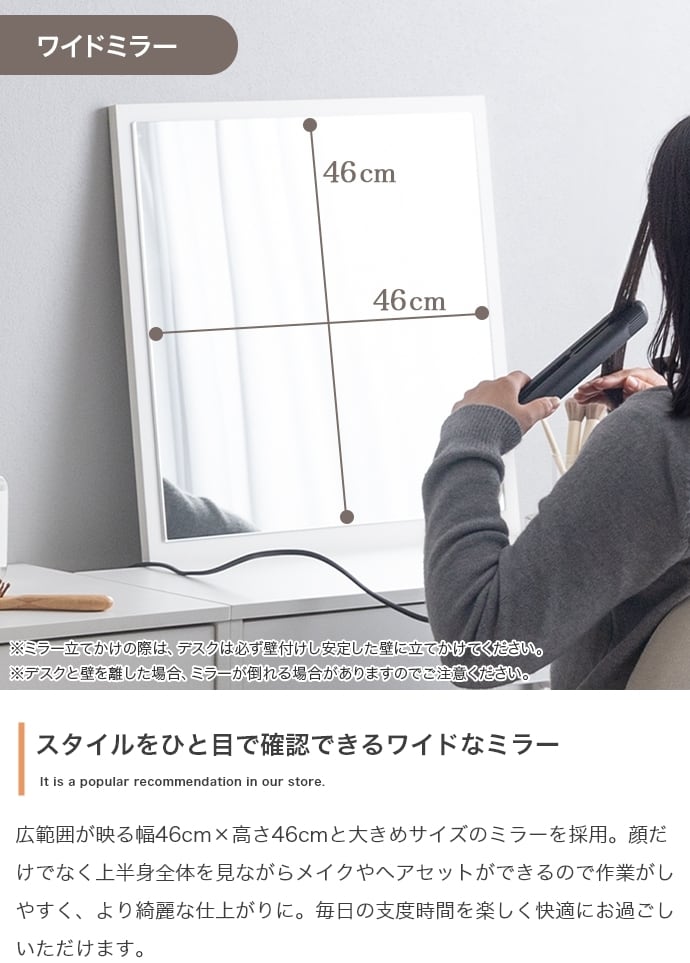 作業にもメイクにも使いやすい広さで、デスクワークもメイク時間も快適に過ごせます。