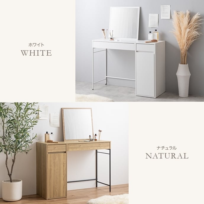 ゆったり使える広めの天板に、コスメやボトル類を整理できる引き出し&扉収納で、大容量収納を実現。