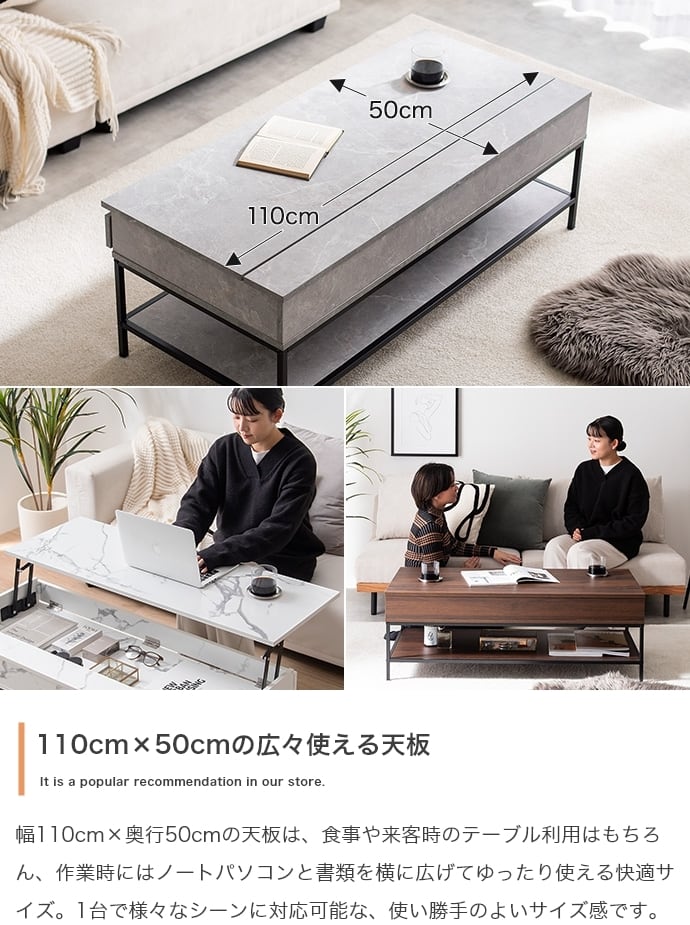 幅110cm×奥行50cmの天板は、食事や来客時のテーブル利用はもちろん、