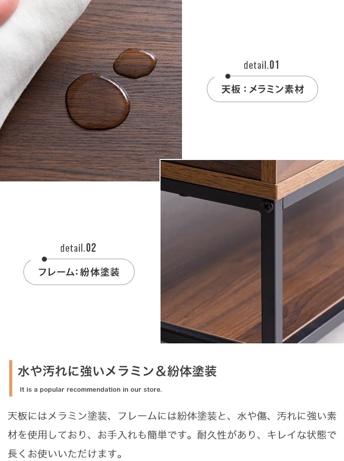 天板にはメラミン塗装、フレームには紛体塗装と、水や傷、汚れに強い素材を使用。お手入れも簡単。