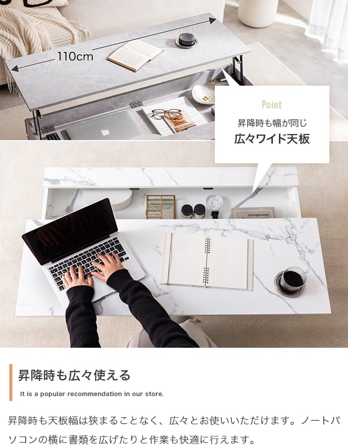 幅110cmのワイド天板は、資料やノートPCを並べても余裕があり広々と利用可能。