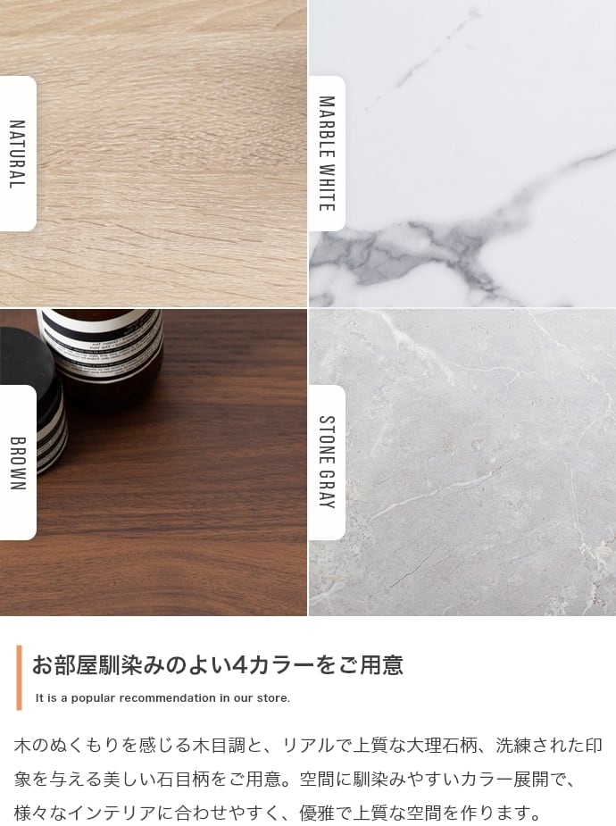 木のぬくもりを感じる木目調と、リアルで上質な大理石柄、洗練された印象を与える美しい石目柄をご用意。