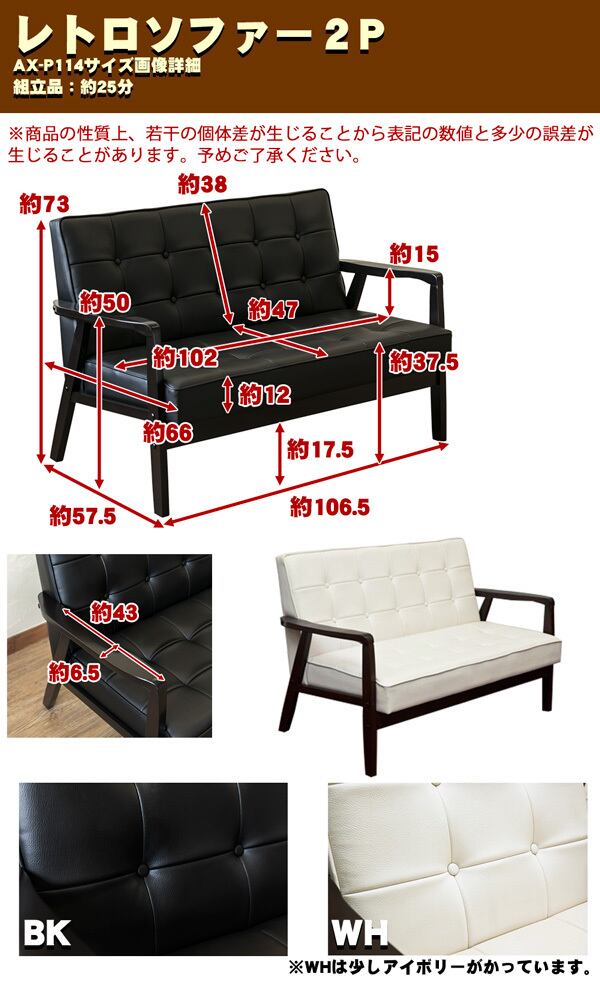 レトロソファ(PVC)2人掛け ブラック/ホワイト