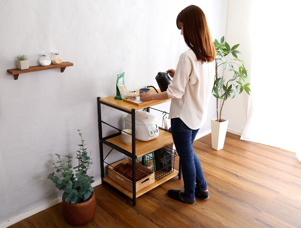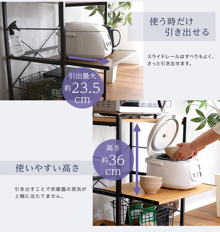 スライドトレーにはポットや炊飯器が置けフレーム構造で熱や蒸気がこもりません。