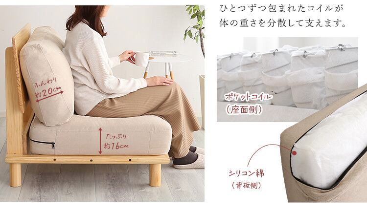 天然木、ファブリック、シリコン綿、ポケットコイル