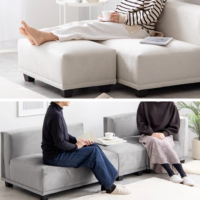カウチスタイルのようにソファにプラスして足を伸ばしたり、単品でスツールのように使ったり、