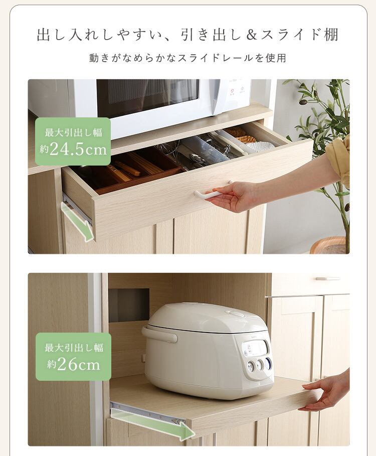 スライドトレー付近には2口コンセントがついているので、炊飯器などを置くのにピッタリ。