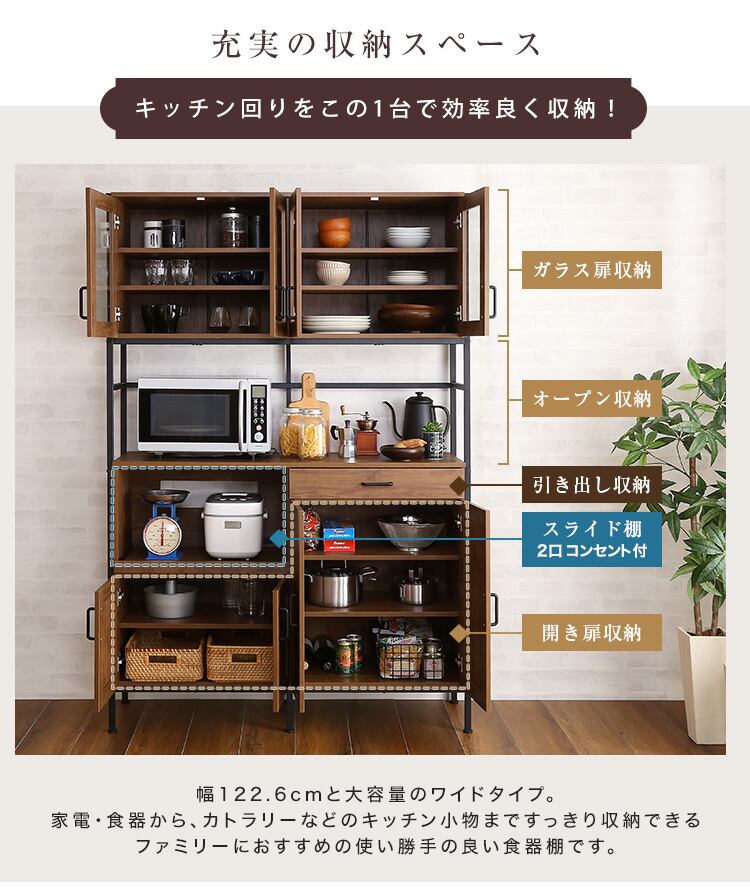 キッチン家電や食器など丸々収納できる大容量でキッチン周りもスッキリ。