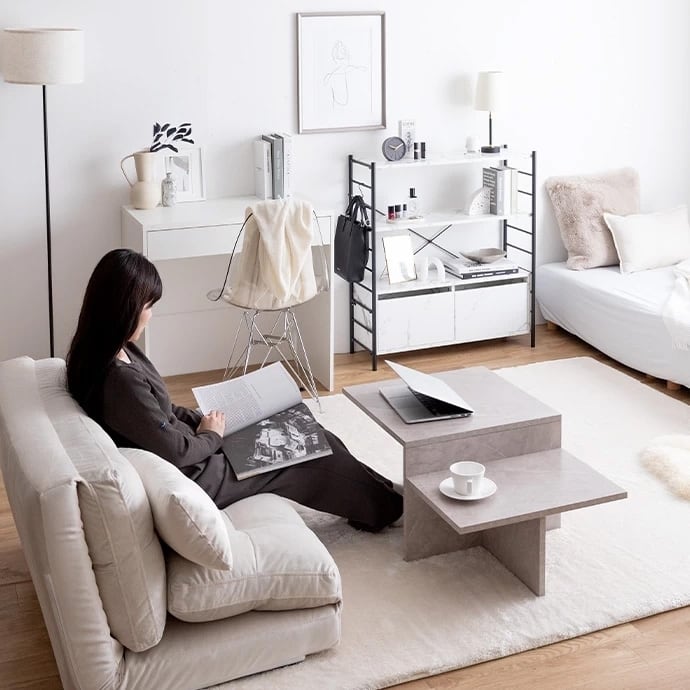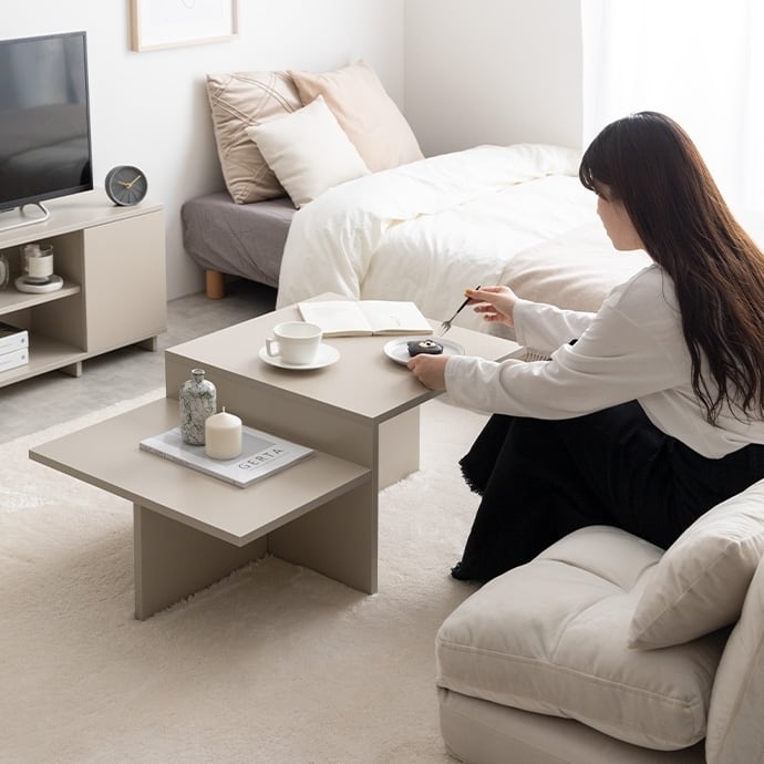 ソファと組み合わせてお使いいただくのはもちろん、床に座るスタイルにも丁度いい高さです。