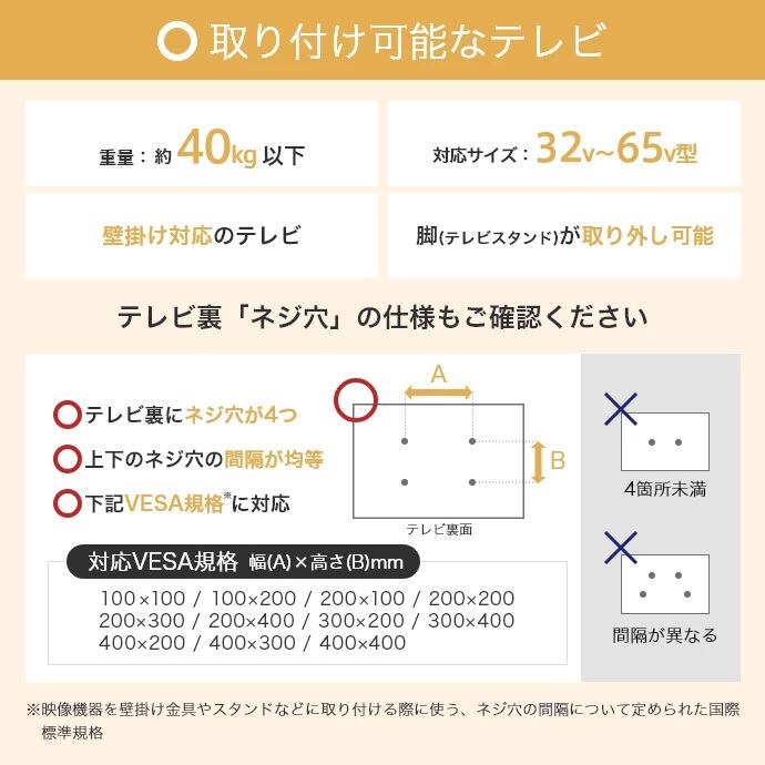 32型~65型のテレビサイズに対応。