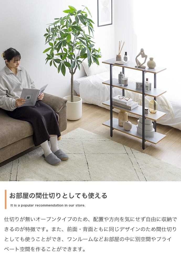 仕切りがないため配置や方向を気にせず収納ができ、お部屋の間仕切りとしても使えます。