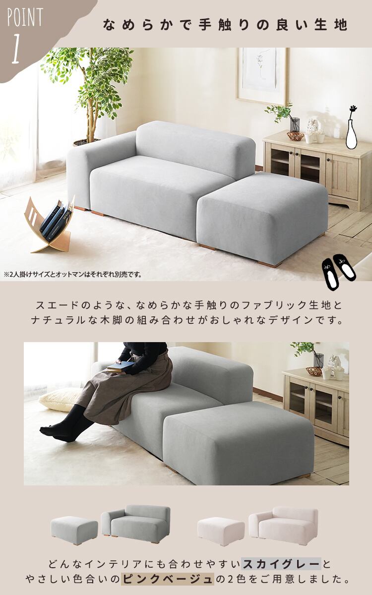 片肘タイプのファブリックソファ モーブ【Mauve】 2人掛けソファ+オットマン スカイグレー/ ピンクベージュ